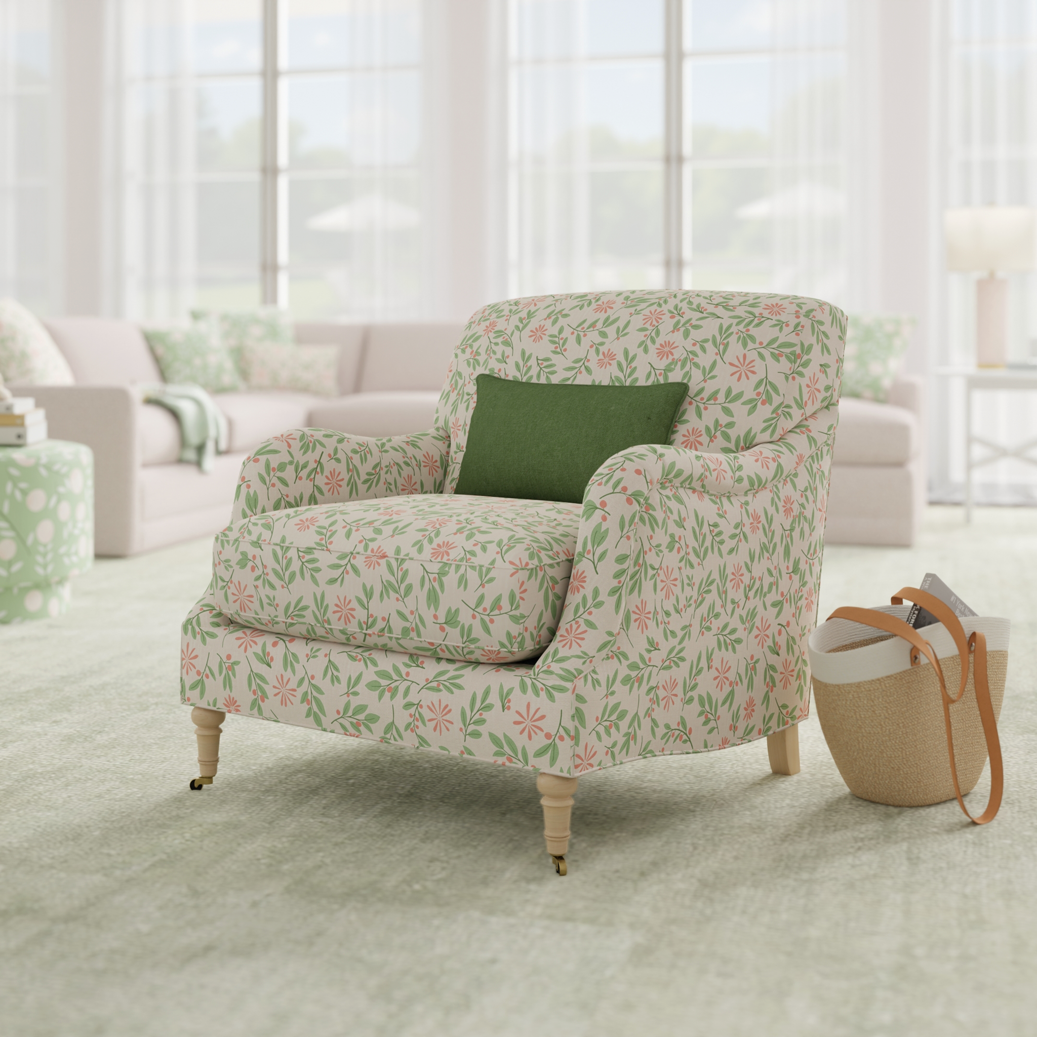 Perched on classic turned legs with brass casters as standard, Tessa glides into any room with quiet sophistication—perfect for a reading nook, bedroom corner, or as a pretty little pair in your living space. As always, she’s bench-made in America and can be dressed in any of our 95+ colorful Maine Cottage fabrics.