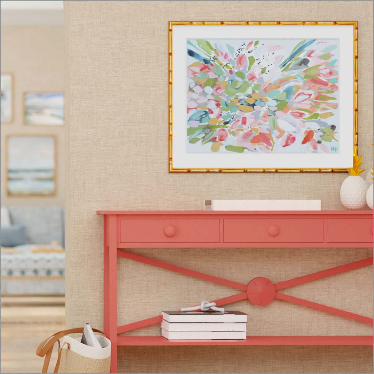Bold, bright, youthful color is what Farm Girl is all about! Taelor Fisher's use of pinks, greens, and teals bring this floral abstract, and any room it resides in, to life!