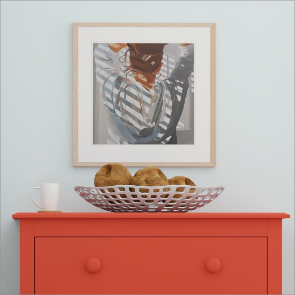 Step into a moment of quiet beauty with Between the Lines by Lori Mehta. This stunning painting captures a woman from behind as she gathers her hair into a bun, bathed in soft, filtered light streaming through window blinds. The interplay of light and shadow creates a striking composition, evoking a sense of calm, contemplation, and everyday elegance.